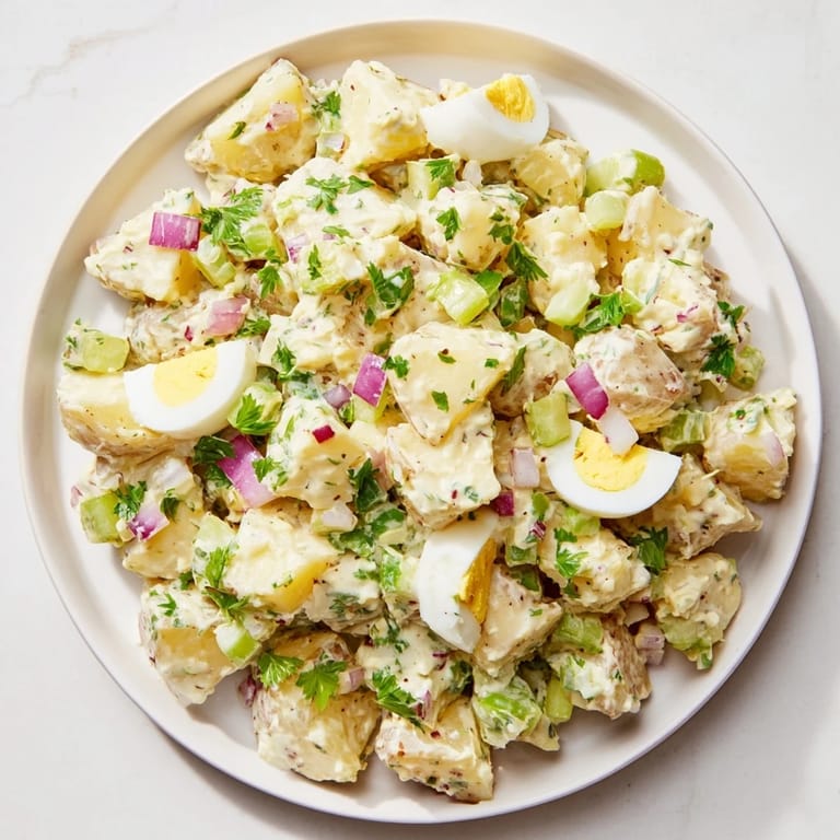 Save Standing in my grandmother's kitchen on a humid July afternoon, watching her transform a heap of boiled potatoes into something magical. The ceramic bowl she used had been in the family for three generations, its edges worn smooth from decades of stirring. She never measured anything, just tasted and adjusted, and somehow her potato salad was always the first dish to disappear at family gatherings. What she taught me wasn't just a recipe, but that simple food made with care becomes memory.