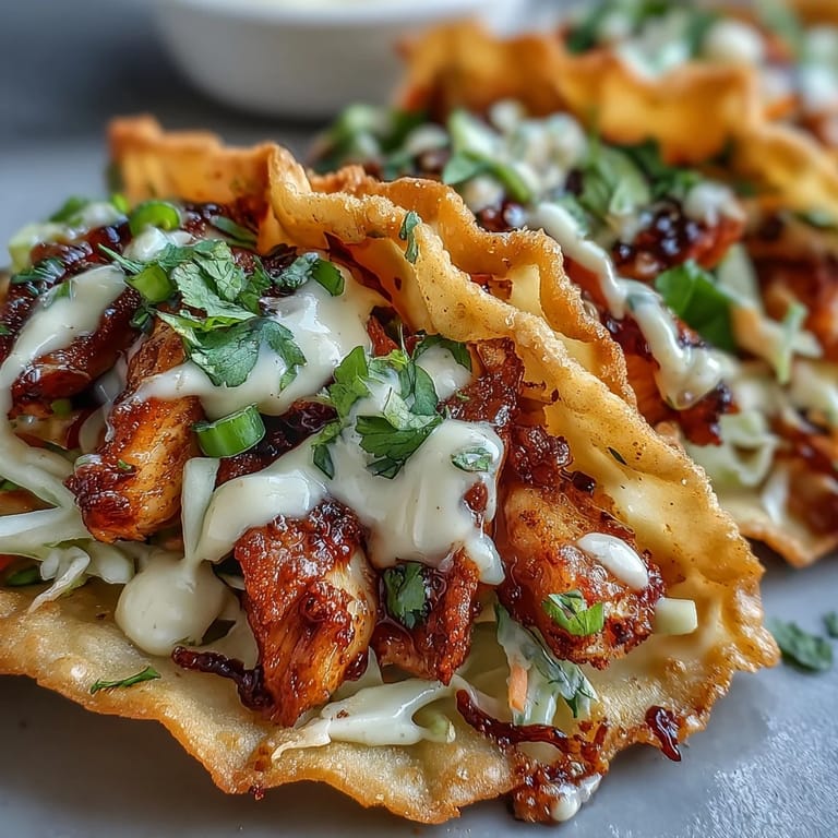 Save My neighbor knocked on the door one Saturday with a Tupperware of something that smelled like ginger and lime, and when I bit into one of those crispy shells, I knew I had to figure it out. She called them wonton tacos, and I spent the next week tinkering with chicken marinades and frying temperatures until I landed on this version. The crunch of the shell against the smoky, tender chicken is what hooked me first, but the tangy slaw and creamy sriracha drizzle made it unforgettable. Now I make them whenever I want to impress without the fuss of a full dinner party. They disappear faster than I can fry the shells.